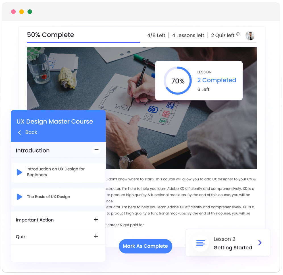Use our drag-and-drop builder to structure your curriculum, lessons, and quizzes. No technical skills needed.